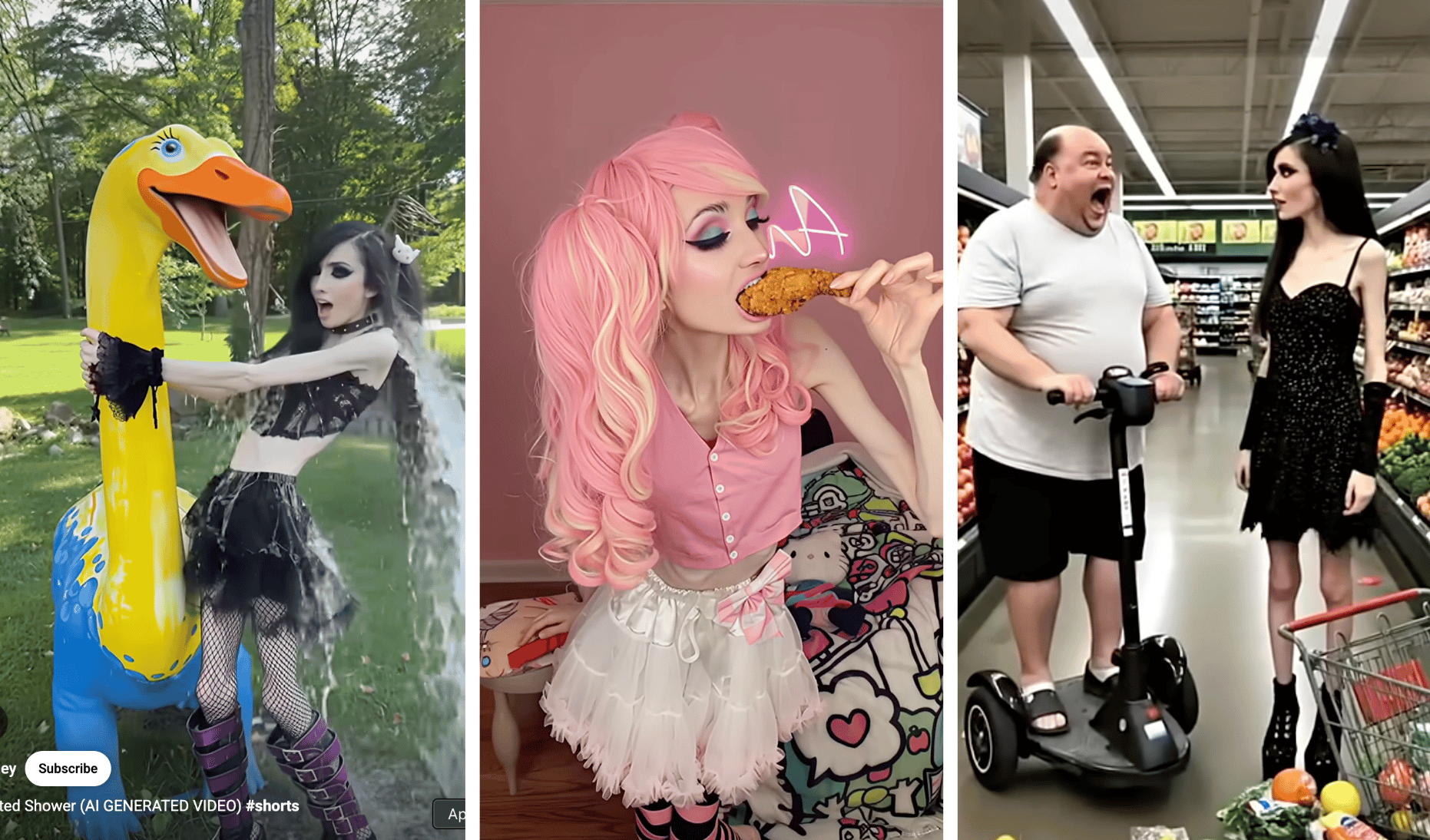 Screenshots of AI-generated videos of the influencer Eugenia Cooney, posted on YouTube Shorts by an account that typically archives real clips of her.