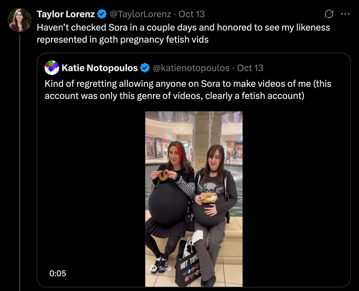 A screenshot of a post on X from Taylor Lorenz: “Haven’t checked Sora in a couple days and honored to see my likeness represented in goth pregnancy fetish vids.” Lorenz is quote-posting tech journalist Katie Notopoulos, who wrote: “Kind of regretting allowing anyone on Sora to make videos of me (this account was only this genre of videos, clearly a fetish account)”