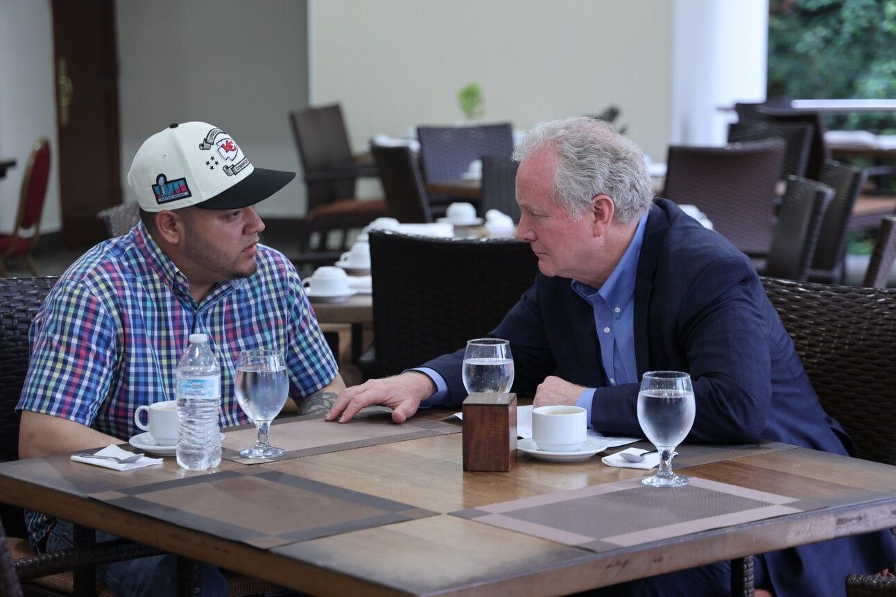 In this handout provided by Sen. Van Hollen's Office, U.S. Sen. Chris Van Hollen (D-MD) meets with Kilmar Armando Abrego Garcia (L) at an undisclosed location on April 17, 2025 in San Salvador, El Salvador. (Photo by Sen. Van Hollen's Office via Getty Images)
