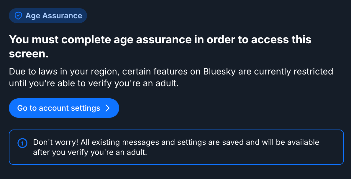 A screenshot of my Bluesky app prompting me to “complete age assurance in order to access this screen,” Bluesky’s attempt to comply with age verification laws in Ohio.